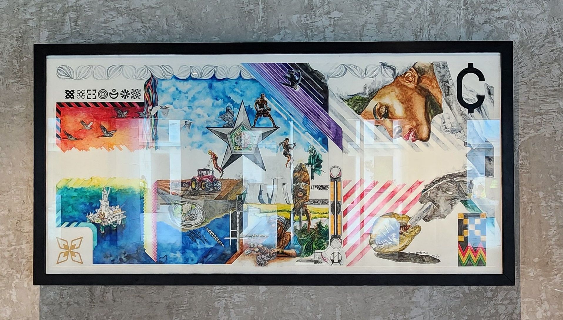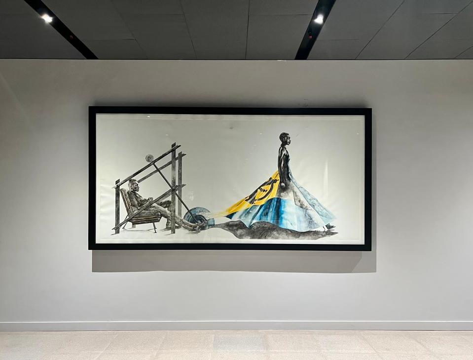 Private client commissions include ASAASE YAA (160 × 320 cm) and AKUABA (200 × 120 cm), two large‑scale surreal watercolour pieces.